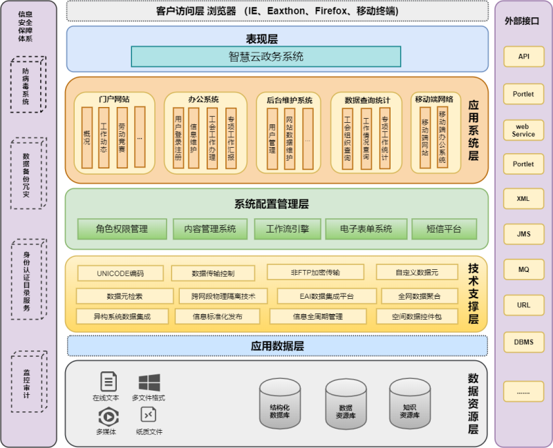 本項目旨在通過集成云計算、移動互聯(lián)、大數(shù)據(jù)等新興技術(shù),迎合目前電子政務(wù)系統(tǒng)向精細(xì)化、智能化、社會化的智慧云政務(wù)系統(tǒng)發(fā)展的趨勢,解決傳統(tǒng)電子政務(wù)系統(tǒng)較難實現(xiàn)的跨界業(yè)務(wù)協(xié)同(全景業(yè)務(wù)模式)、異構(gòu)平臺數(shù)據(jù)訪問、多維度智能表單等關(guān)鍵技術(shù),實現(xiàn)云端政務(wù)子系統(tǒng)、內(nèi)容管理子系統(tǒng)、工作流平臺、多維度智能表單系統(tǒng)、跨平臺數(shù)據(jù)訪問中間件、基于元數(shù)據(jù)的動態(tài)指標(biāo)庫、基于ArcGIS的GIS數(shù)據(jù)調(diào)用中間件等功能模塊,主要由公眾平臺、政務(wù)平臺、決策平臺三大平臺組成,形成支持智慧政府協(xié)作的新一代智慧云政務(wù)系統(tǒng)。主要內(nèi)容如下: